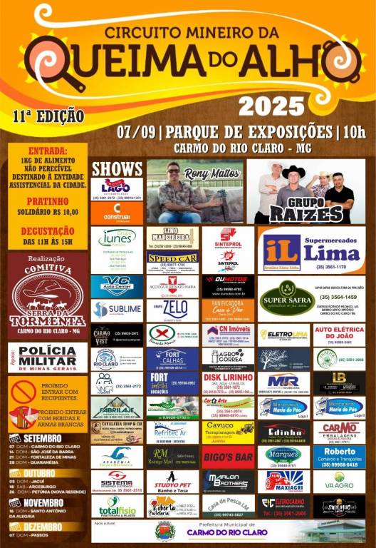 Na data de 07/09/2025, o Rotary Club de Carmo do Rio Claro, participou do tradicional circuito de Minas Gerais da Queima do Alho. A finalidade foi ajudar na arrecadação de doação para o Lar do Idoso (Produtos de Alimentação) e para o Hospital São Vicente de Paulo (Financeiro).